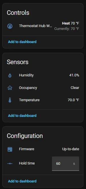 Because the thermostat is in a high-traffic area, I use its presence sensor as a trigger point for household reminders. For example, if the dog water fountain is low, Home Assistant can announce it when someone walks into the room instead of sending a notification that might get ignored.