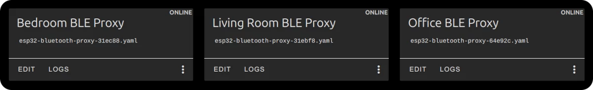 - Install ESPHome on the ESP32 boards as a Bluetooth Proxy. You can use either the ESPHome Ready-Made Projects website or the ESPHome Builder add-on for Home Assistant.