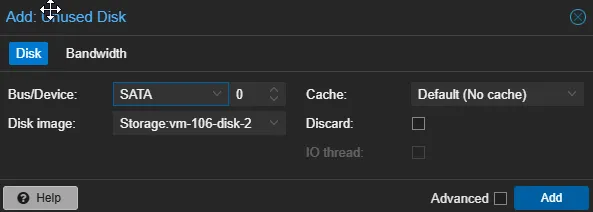 - Double-click the disk and set Bus/Device to SATA. Select Add.