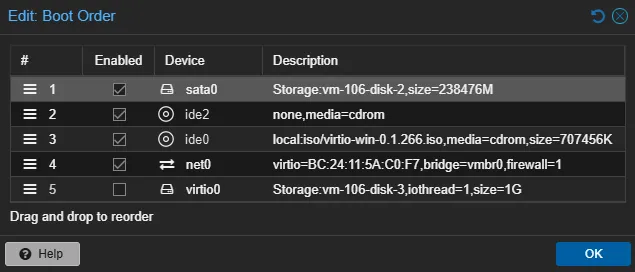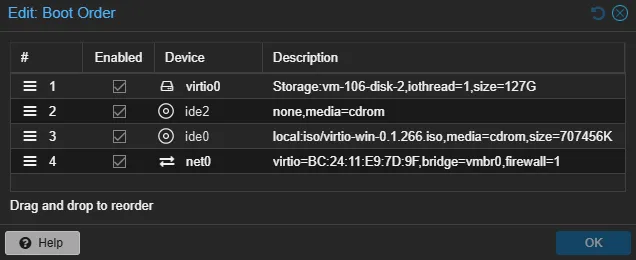- Update the Boot Order to use the VirtIO disk.