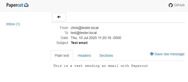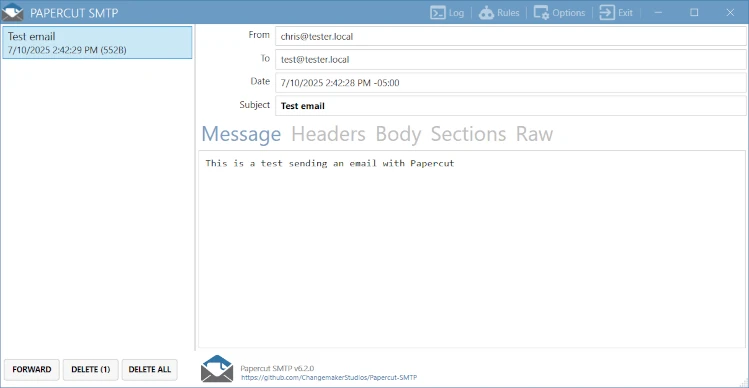 Papercut is a local SMTP server designed for developers. It accepts email messages but doesn’t actually deliver them—it just captures and displays them. You can view the content, subject, headers, attachments, and everything else you need to verify your app is working as expected.