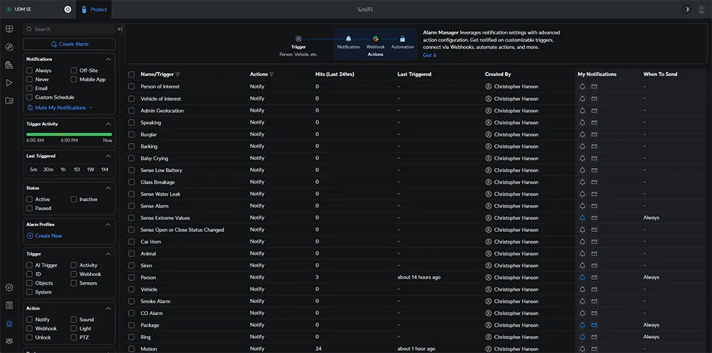 UniFi Protect Alarm Manager screen