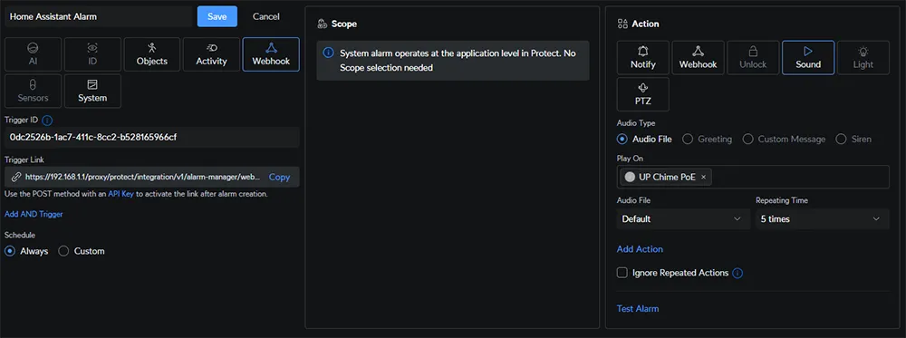 With the webhook automation ready in Home Assistant, we can now create an alarm in UniFi Protect to send that webhook.
